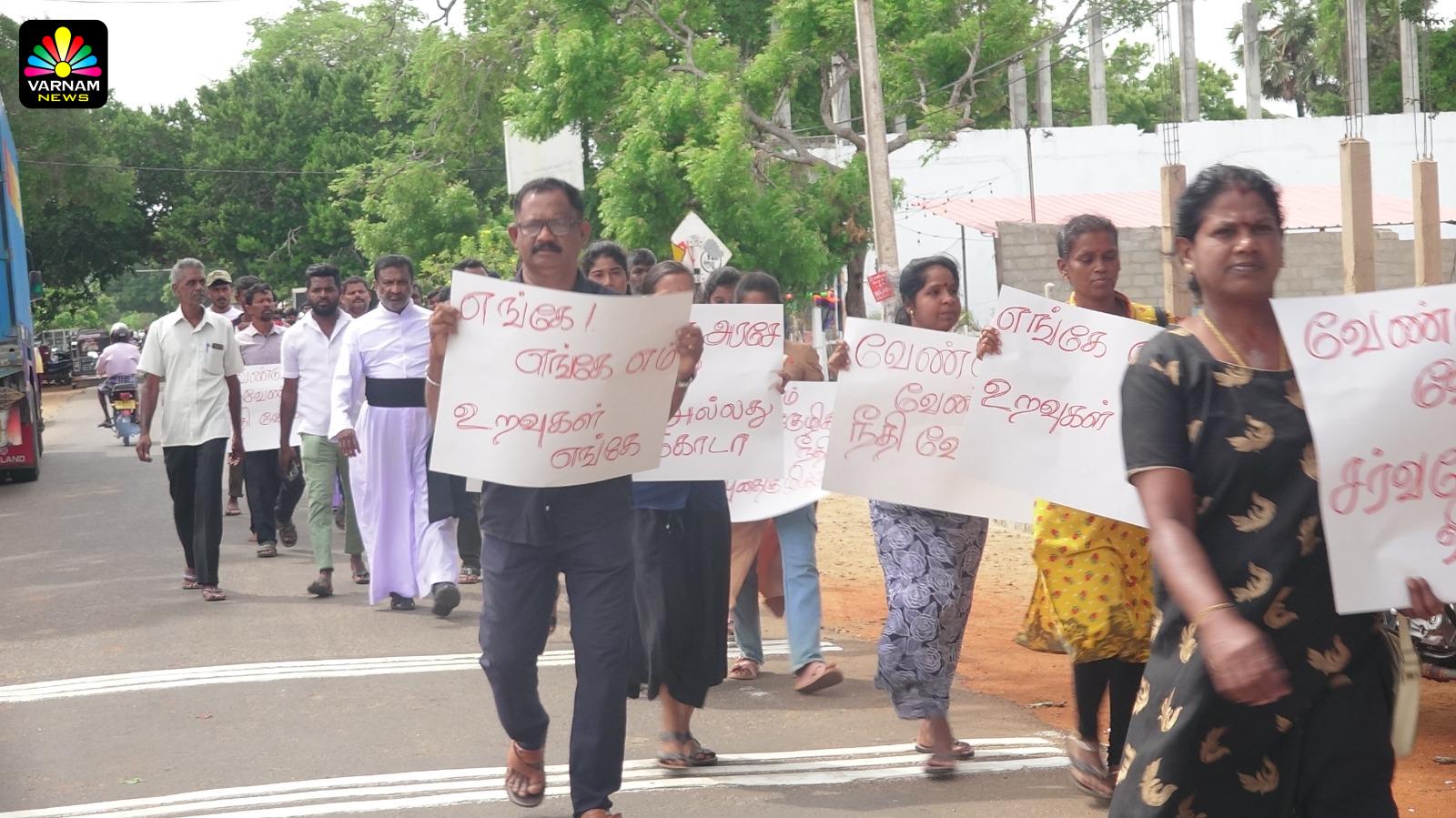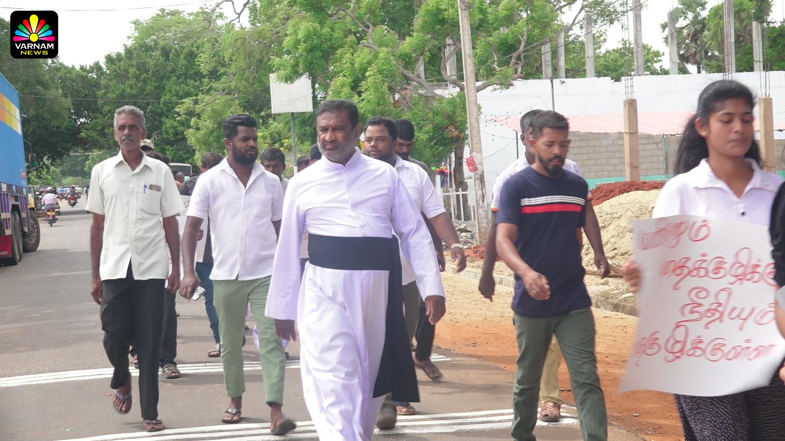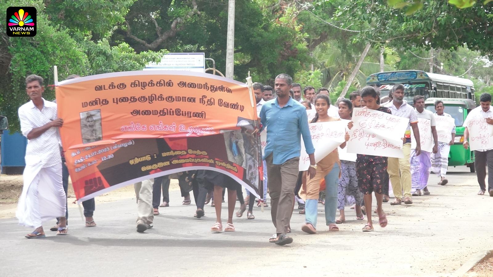 வடக்கு கிழக்கில் கண்டு பிடிக்கப்பட்டுள்ள மனித புதைகுழிகள் தொடர்பில் நீதிகோரி மன்னார் அடம்பன் சந்தியில் இருந்து திருக்கேதீஸ்வரம் மாந்தை மனிதப் புதைகுழி வரை இன்று (24.07)வியாழக்கிழமை காலை அமைதிப் பேரணி ஒன்று முன்னெடுக்கப்பட்டது.