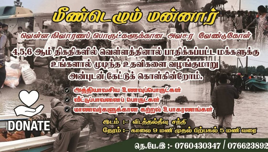 உறவுகளிற்கு கரம் கொடுப்பதற்காக “மீண்டெழும் மன்னார் ” எனும் தொனிப்பொருளில் எதிர்வருகின்ற 4,5,6 ம் திகதிகளில் மாவட்டம் தழுவிய ரீதியில் 9 இடங்களில் மக்களுக்கான அத்தியாவசிய பொருட்கள் மற்றும் பாடசாலை மாணவர்களுக்கான