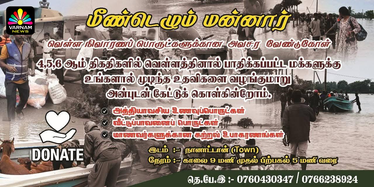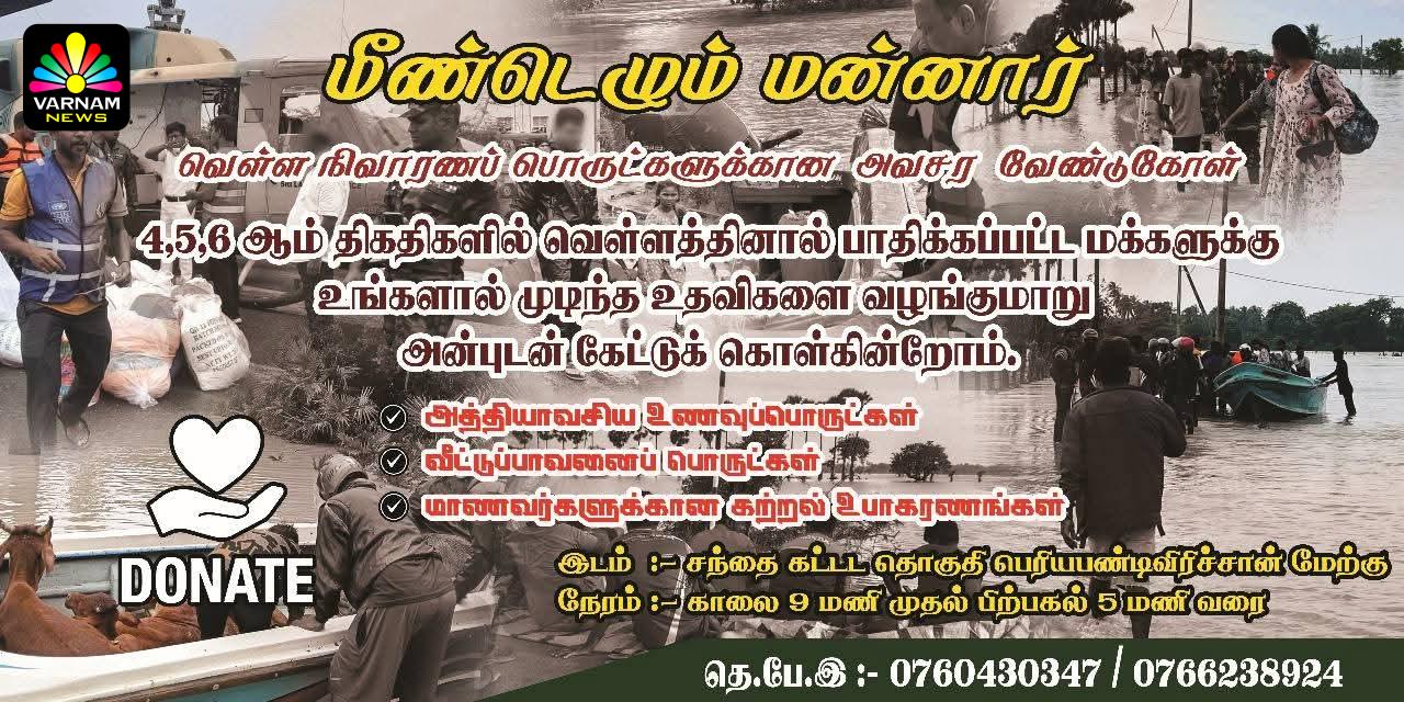 கற்றல் உபகரணங்கள் சேகரிக்க தேசிய மக்கள் சக்தி கட்சி உறுப்பினர்களால் நடவடிக்கை எடுக்கப்பட்டுள்ளது. எனவே இந்த “மீண்டெழும் மன்னார்” நடவடிக்கைக்கு இயன்ற வரையில் உதவுமாறு தேசிய மக்கள் சக்தி கட்சி உறுப்பினர்கள் மக்களிடம் வேண்டுகோள் விடுக்கின்றனர்.